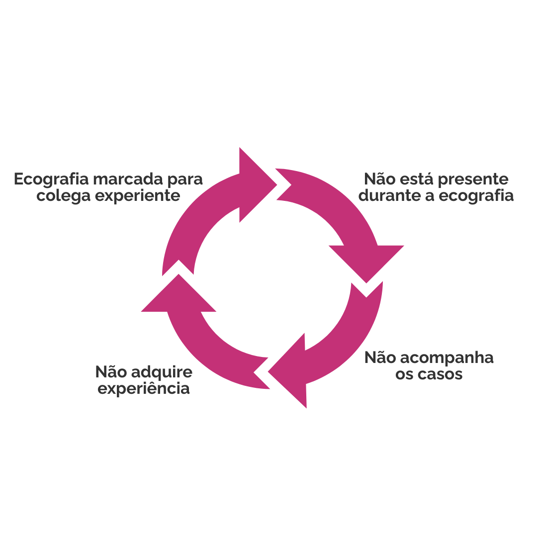 Quando queremos desenvolver uma competência prática como a ecografia abdominal, frequentemente encontramo-nos presos num ciclo que limita o nosso crescimento. Uma vez que as nossas competências são básicas, os casos de ecografia são passados para um colega mais experiente. Muitas vezes não conseguimos nem acompanhar a ecografia, nem praticar com aquele paciente, perdendo o seguimento do caso e continuando com falta de experiência e competência em ecografia.